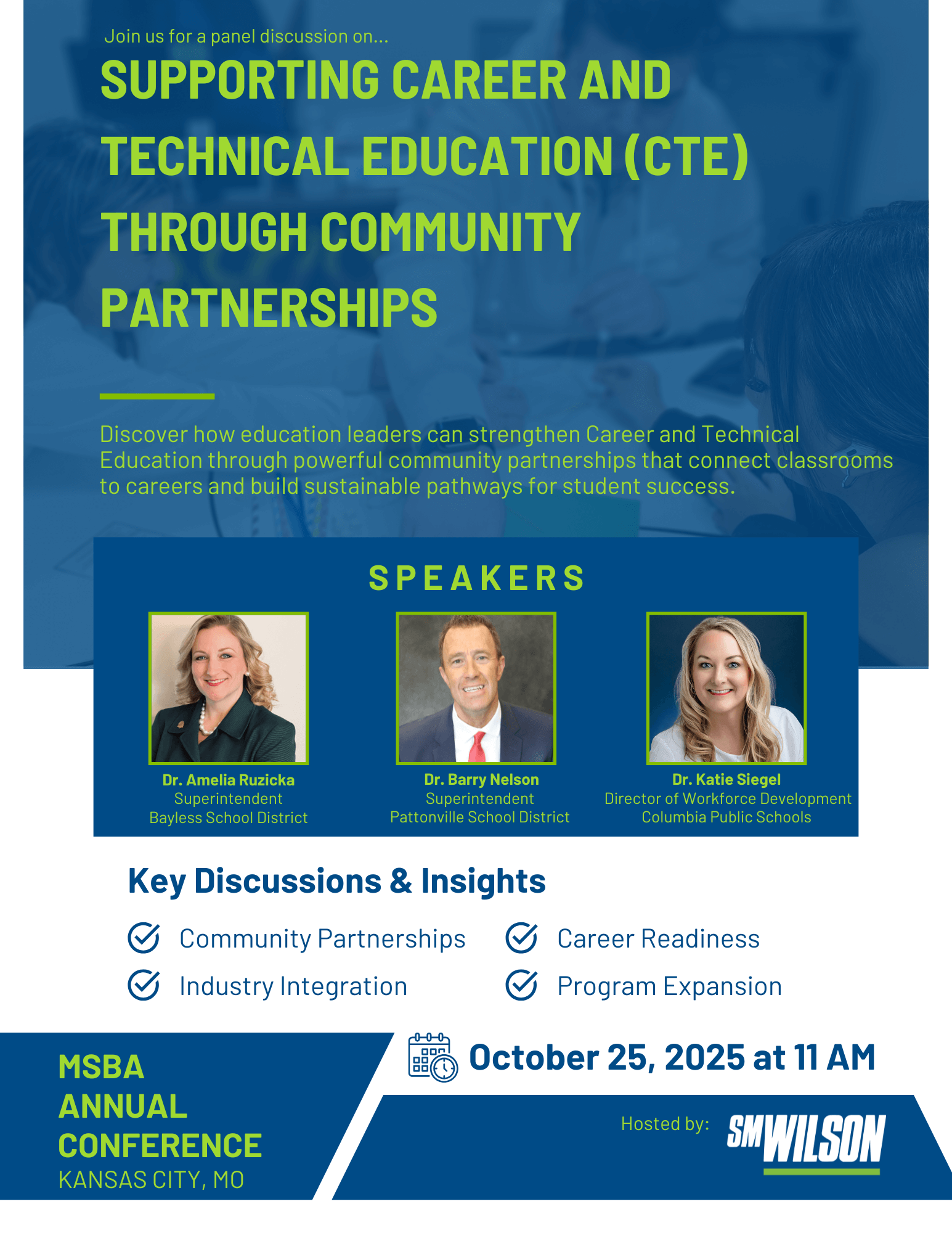 This article was based on the S. M. Wilson-hosted “Supporting Career and Technical Education (CTE) Through Community Partnerships” session at the 2025 Missouri School Board Administrators (MSBA) Annual Conference. Designed for education administrators and boards of education, the session explored strategies for strengthening Career and Technical Education (CTE) programs through meaningful community partnerships.